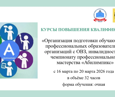 Реализованы курсы повышения квалификации педагогических работников по программе ДПО «Организация подготовки обучающихся с ОВЗ, инвалидностью к чемпионату профессионального мастерства «Абилимпикс» в Омском педагогическом колледже № 1 (БПОО)