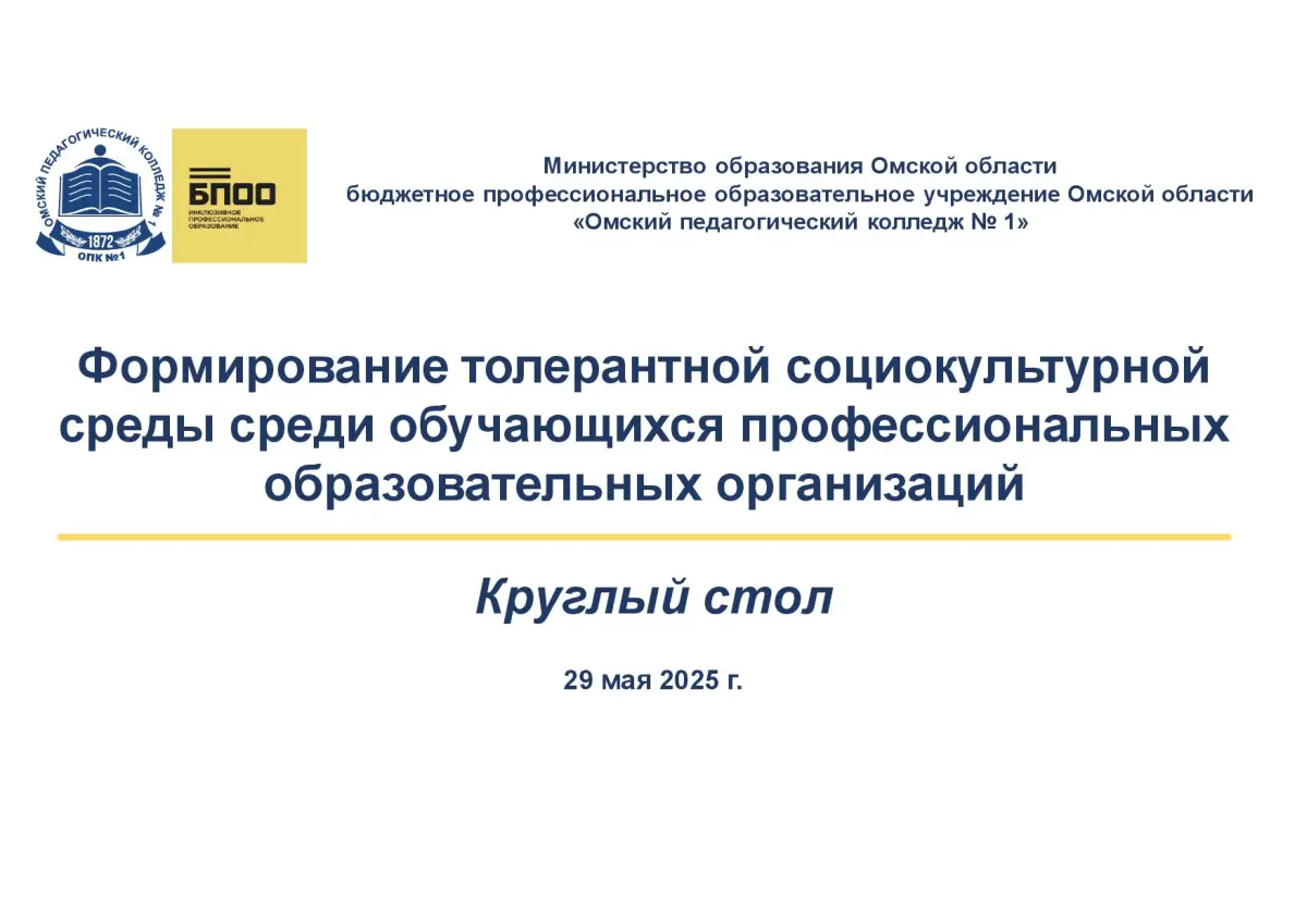 29 мая 2025 года БПОУ «Омский педагогический колледж № 1» (БПОО) инициировал заседание круглого стола по вопросам формирования толерантной социокультурной среды среди обучающихся профессиональных образовательных организаций.
