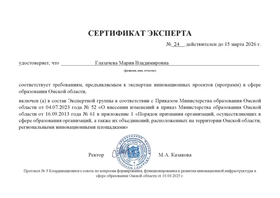10 апреля 2025 года на базе БОУ ДПО «Институт развития образования Омской области» состоялось заседание Координационного совета по вопросам формирования, функционирования и развития инновационной инфраструктуры в сфере образования, на котором обсуждались вопросы организации, результатов обучения и формирование списка экспертов по оценке инновационных проектов (программ) в сфере образования Омской области на 2025 год.