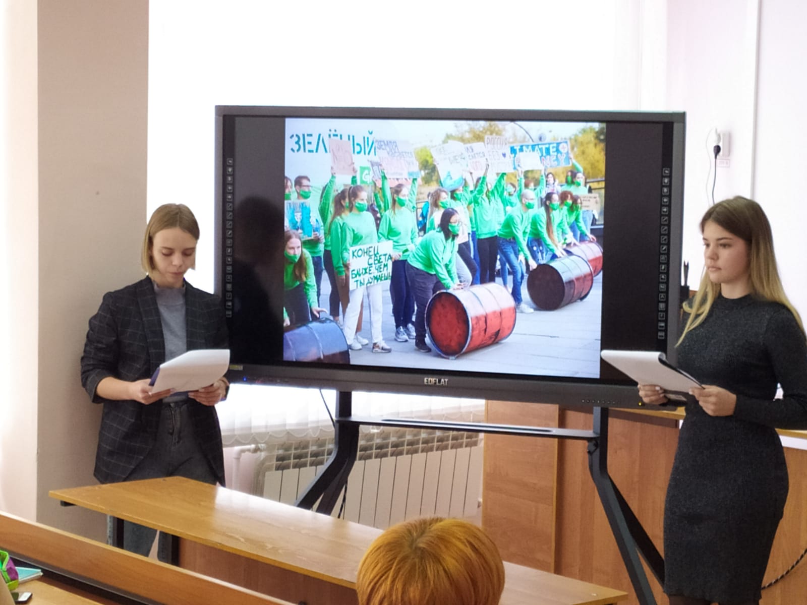 Студенты узнали, об истории появления и направлениях работы природоохранной организации «Гринпис», что в переводе с английского (green peace) означает «Зеленый мир». Своей целью «Зеленый мир» ставит привлечение общественного внимания к решению проблем экологии в мире.