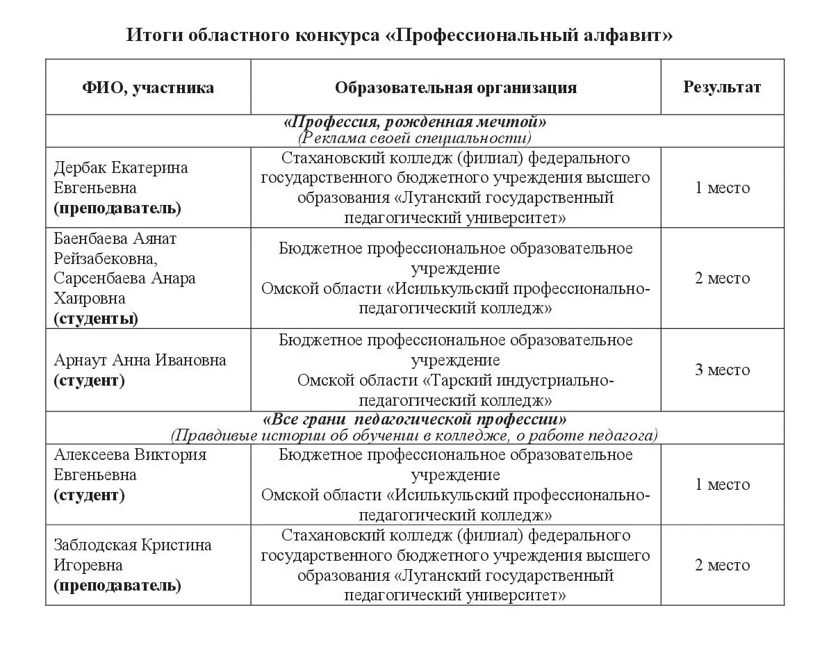 В Конкурсе принимали участие педагоги и обучающиеся профессиональных образовательных организаций Омской области, реализующие педагогические специальности, а также Стахановский педагогический колледж Луганской Народной Республики в номинациях: