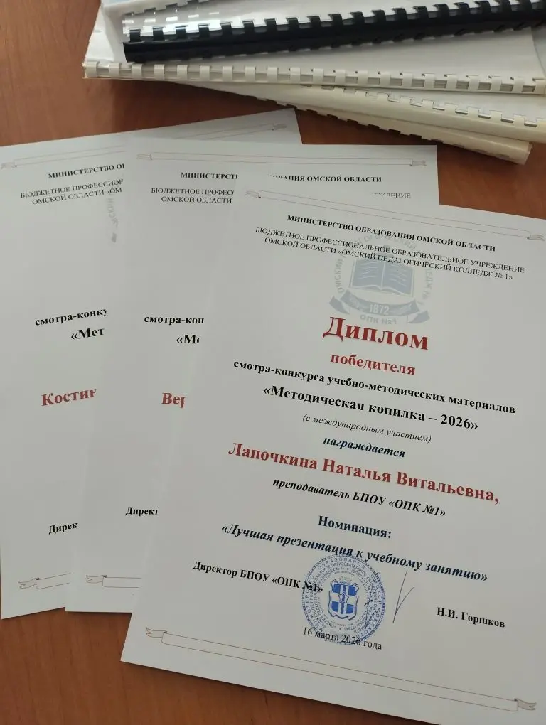 С 16 февраля по 16 марта 2026 года в Омском педагогическом колледже № 1 проходил смотр-конкурс учебно-методических материалов «Методическая копилка-2026» с целью стимулирование научного, методического и творческого потенциала преподавателей, а также совершенствования, обновления и пополнения учебно-методических комплексов. Организатором выступил Центр методической и проектной деятельности БПОУ «ОПК №1».
