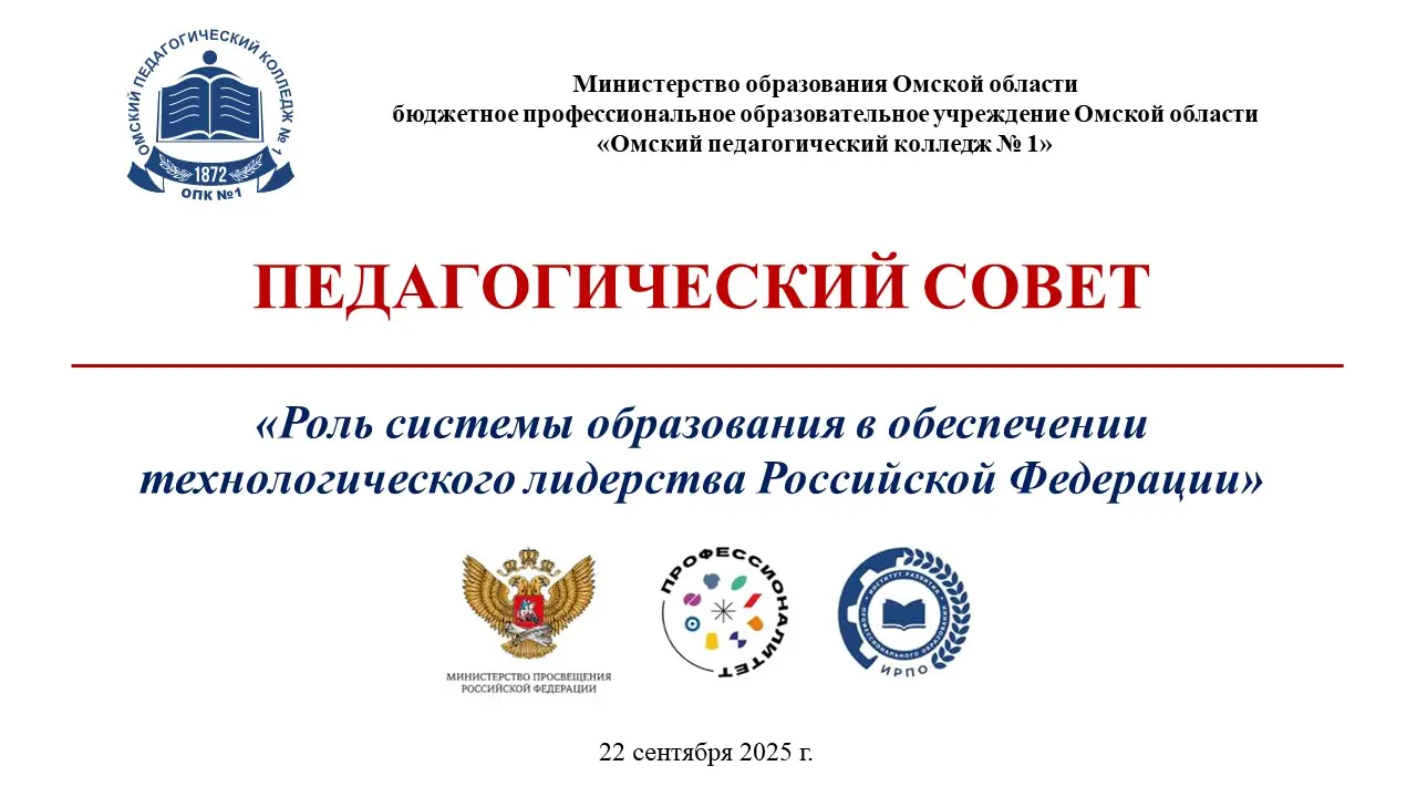 22 сентября 2025 года в Омском педагогическом колледже № 1 состоялся педагогический совет «Роль системы образования в обеспечении технологического лидерства Российской Федерации».