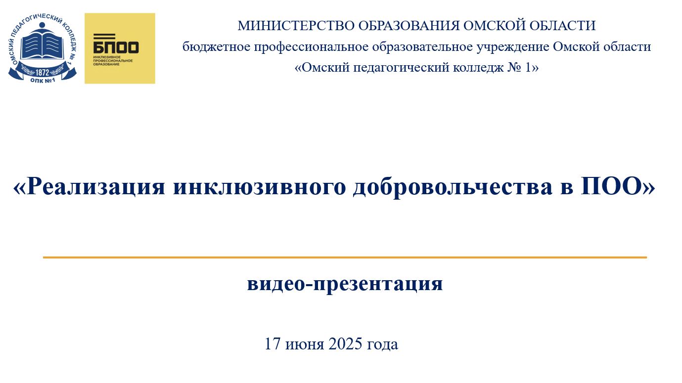17 июня 2025 года Омский педагогический колледж № 1 обобщил работу колледжа в области инклюзивного добровольчества и поделился с коллегами в форме видео-презентации.