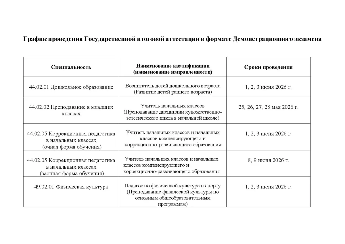 В 2025/26 учебном году Государственную итоговую аттестацию в формате Демонстрационного экзамена профильного уровня, кроме выпускников 37 КП группы (классный руководитель Н.В. Рогозинская) и 404 КП группы заочной формы обучения специальности 44.02.05 Коррекционная педагогика в начальном образовании, будут сдавать и выпускники других специальностей: