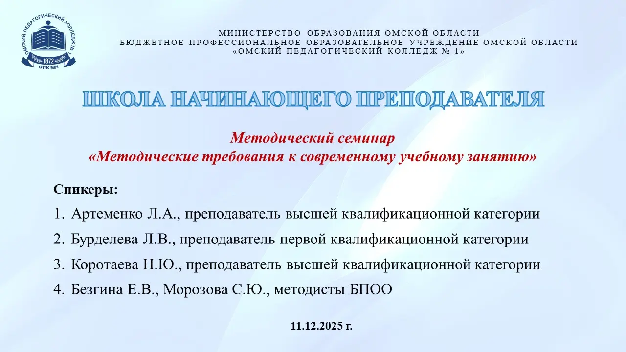 11 декабря 2025 г. в БПОУ «Омский педагогический колледж № 1» состоялся методический семинар для молодых педагогов «Методические требования к современному учебному занятию» с учетом особых образовательных потребностей обучающихся. Мероприятие также проводилось в рамках деятельности ЦРИК «ПРОинклюзию».