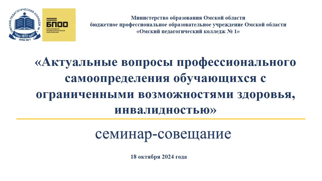 18 октября 2024 года было проведено совещание с представителями школ Советского административного округа города Омска, ответственными за профориентационную работу с обучающимися в образовательной организации на тему «Актуальные вопросы профессионального самоопределения обучающихся с ограниченными возможностями здоровья, инвалидностью». Присутствовали специалисты Гимназии № 12, Лицея № 143, СОШ №№ 129, 51, 112, 86.