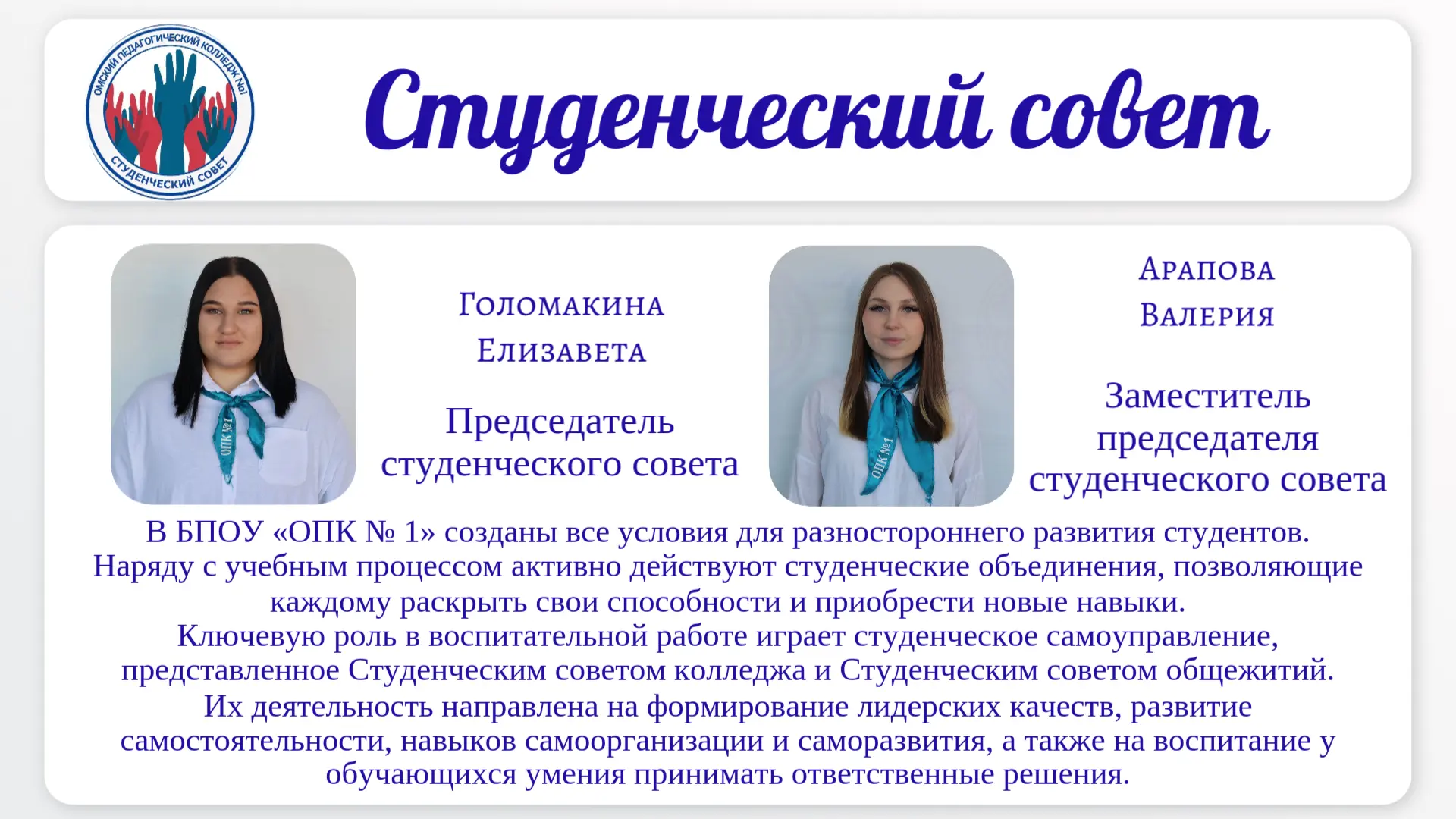 В колледже осуществляет свою деятельность Совет музея истории ОПК № 1, которым руководит преподаватель Л.С. Зубарева. Целью работы Совета музея является изучение истории колледжа, обеспечение дополнительного краеведческого и гражданско-патриотического воспитания. Студенты работают с документами музея, проводят экскурсии для обучающихся и других посетителей музея, осуществляют связь с ветеранами педагогического труда.