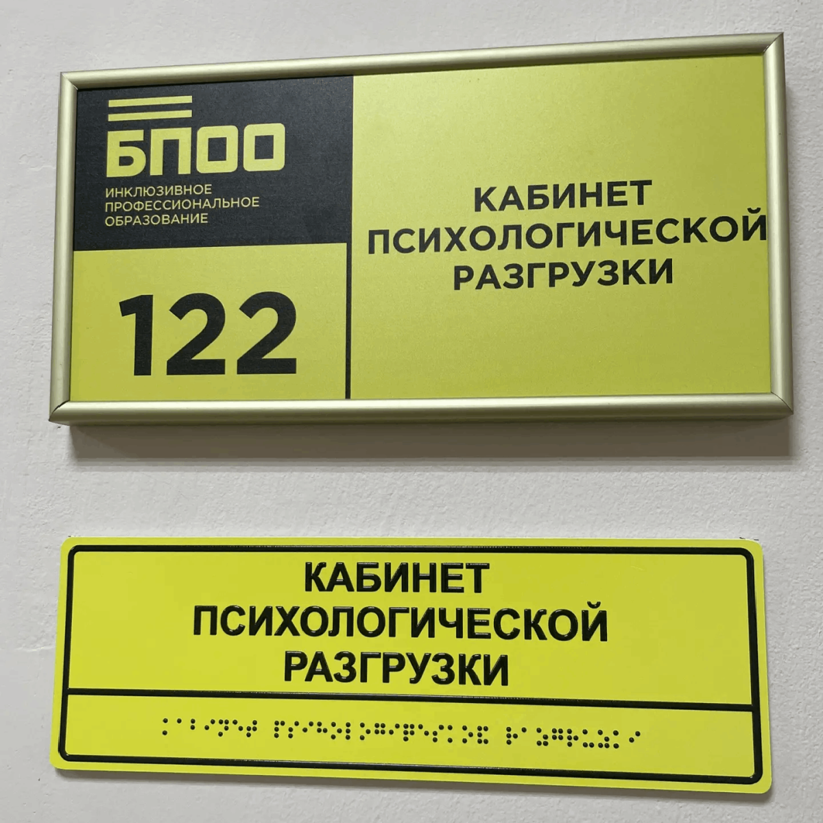 - визуально-тактильные знаки (знаки помещений с дублированием информации шрифтом Брайля)