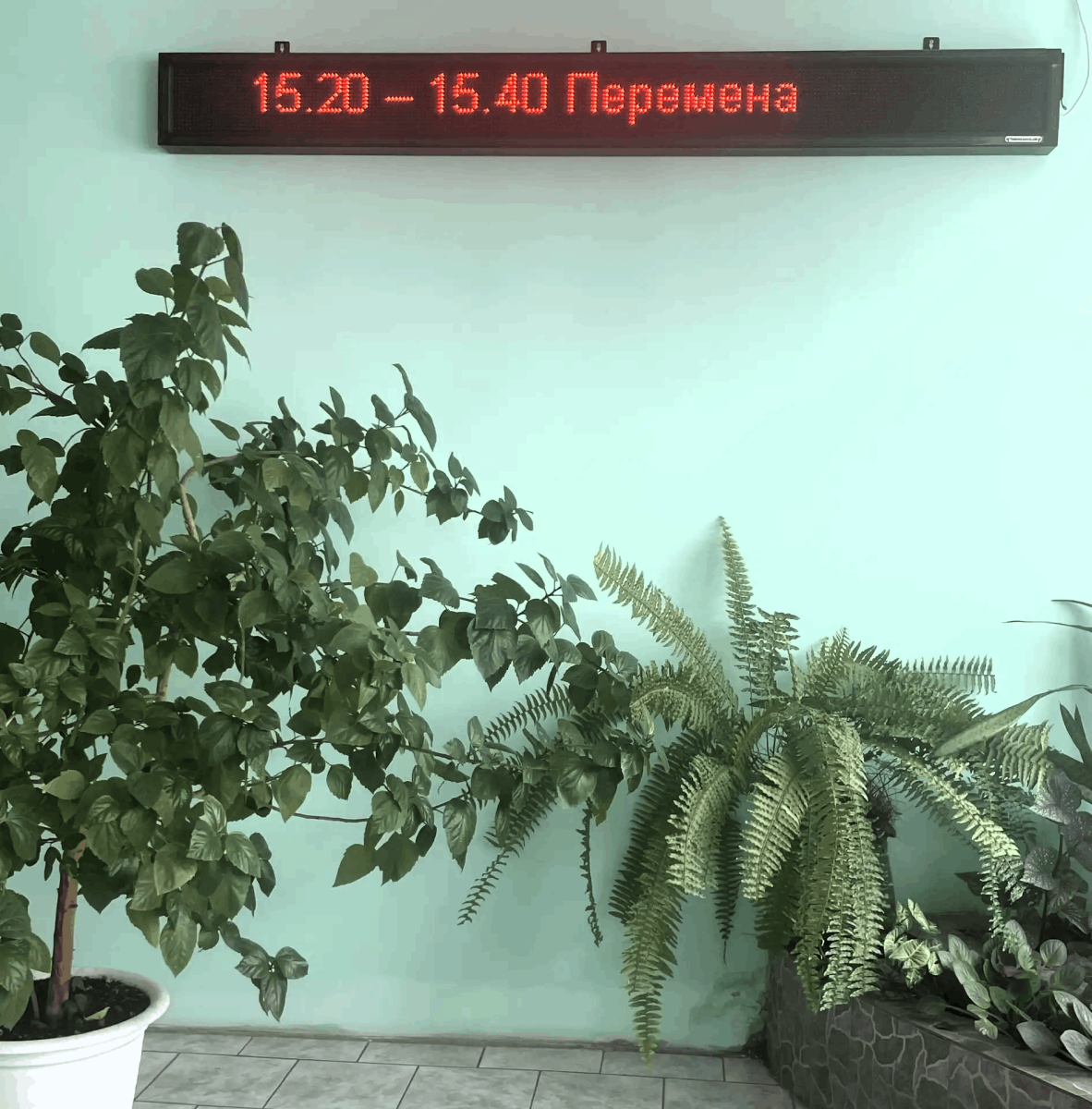 - светодиодные дисплеи («бегущие строки»): информирование режима дня (временной график занятий в режиме текущего времени)